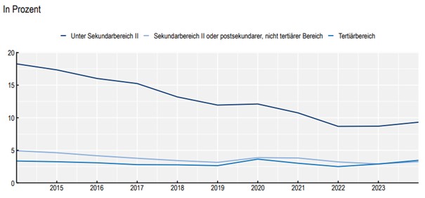 Personen mit höherem Bildungsabschluss sind im Allgemeinen seltener arbeitslos und erzielen höhere Einkommen. Besonders der Abschluss im Sekundarbereich II (z.B. in der gymnasialen Oberstufe oder einer berufsbildenden Schule) spielt eine zentrale Rolle bei der Verringerung des Arbeitslosigkeitsrisikos. Im OECD-Durchschnitt waren im Jahr 2024 12,9 % der wirtschaftlich aktiven 25- bis 34-Jährigen ohne Abschluss im Sekundarbereich II erwerbslos, gegenüber 6,9 % mit einem Abschluss im Sekundarbereich II oder im postsekundaren, nicht tertiären Bereich (z.B. berufliche Fortbildungsabschlüsse wie Meister, Techniker oder Fachwirt). Unter jungen Erwachsenen mit Tertiärabschluss liegt die Erwerbslosenquote bei 4,9 %.